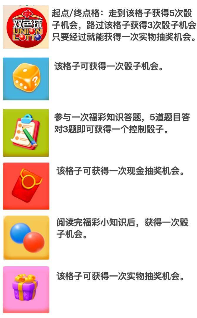 棋盘上的每一个格子都设计巧妙,既有考验福彩常识的趣味问答,也暗藏额外掷骰子等惊喜互动。游戏中每个格子的功能如下: