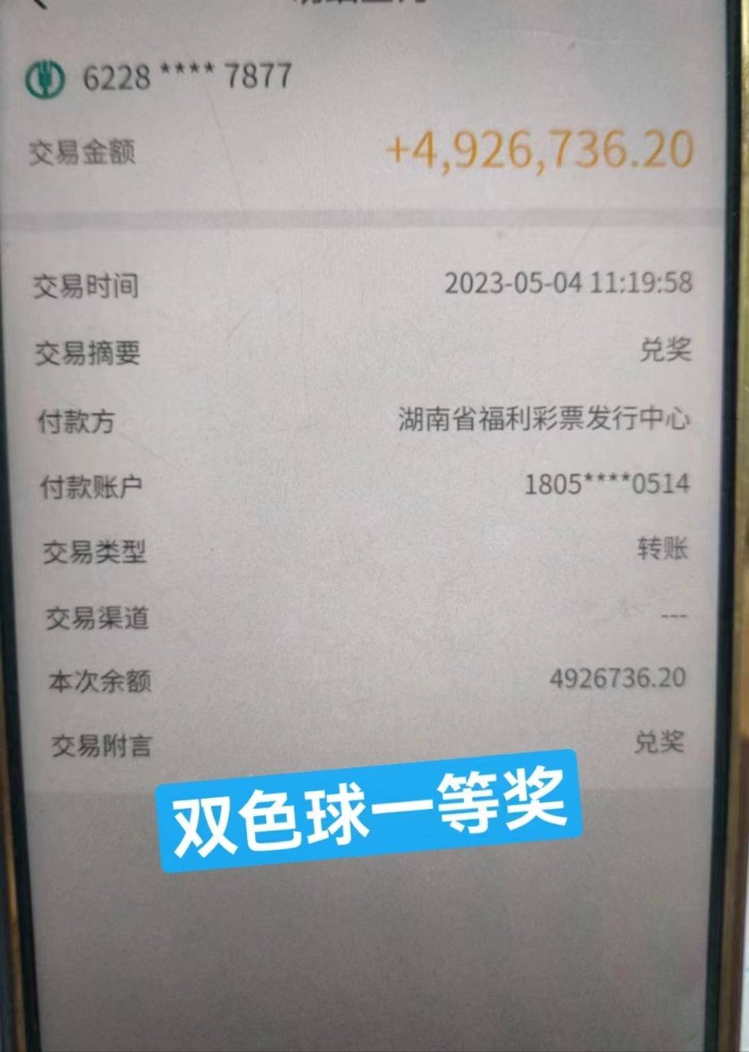 除了中奖彩票曝光外,当时的奖金到账信息也被曝光出来,从付款方可以清晰看出,是湖南省福利彩票发行中心,交易金额为4926736.2元。为何到账金额和中奖金额不相符,因为单注奖金超过一万元,需要缴纳20%的个人所得税,所以当期一等奖奖金和二等奖奖金都要缴纳20%个人所得税,其余固定奖则免税。最后到账金额为490多万元。